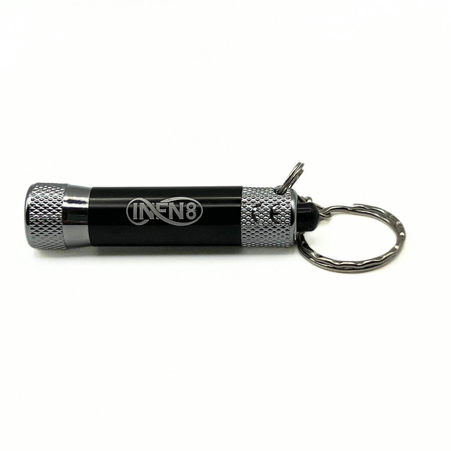 This mini flashlight keychain is a favorite design with its textured silver trim and easy rubber push button. Made of aluminum, these forever lasting flashlights are lightweight yet durable.