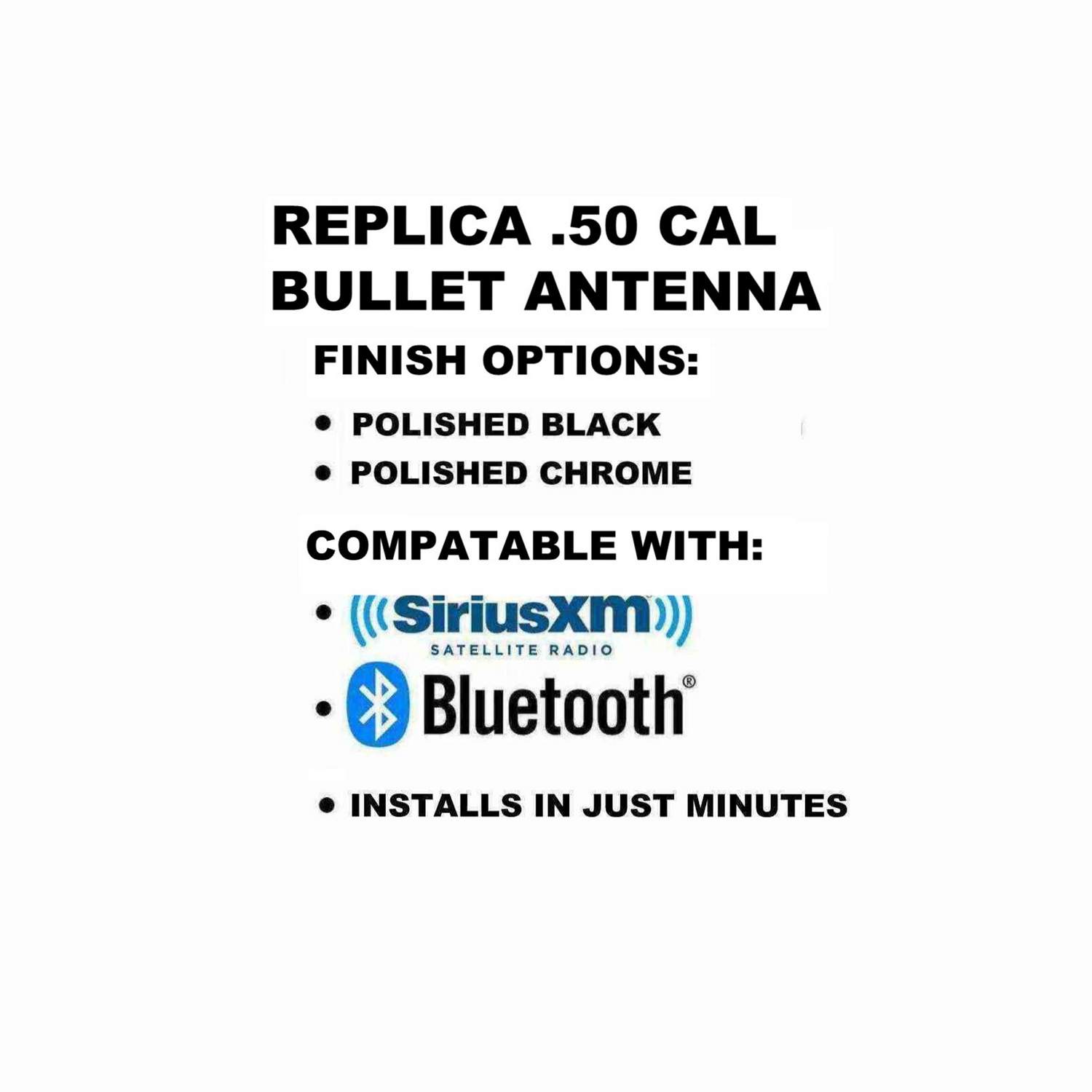 Get ready to tune into your car's best look yet with a 50 Caliber BMG Bullet Antenna. It's not just an antenna, but a statement that stands tall and proud on your vehicle. Crafted from 6061 aluminum, this replica bullet takes the form of a realistic 50 Caliber BMG Bullet. Compatible with many import and domestic vehicles. Includes 11 adapters to ensure you're well-equipped for a smooth and straightforward installation. Now that's what we call sleek functionality!